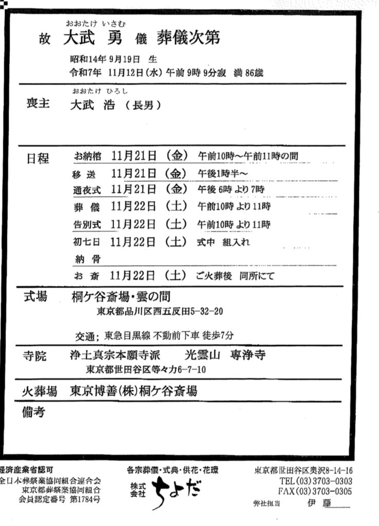 令和7年11月12日、満86歳にてご逝去されました ので、謹んでお知らせ申し上げます。